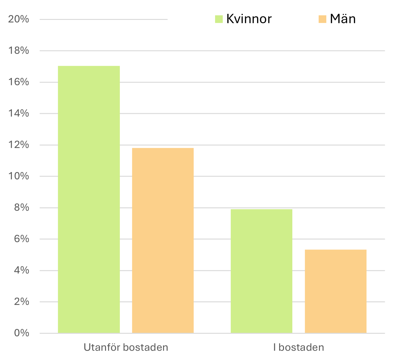 1 juli 2019 trädde lag 2018:2088 i kraft som reglerar rökfria miljöer. Där ingår rökförbud på flera allmänna ytor inomhus och utomhus, till exempel på lekplatser, entréer till allmänna lokaler, i lokaltrafiken och på uteserveringar. Rökförbudet omfattar inte privata bostäder och tillhörande platser, som altaner och balkonger. Därför är exponering för andras rökning fortfarande vanligt i eller nära bostäder, vilket speglas i MHE 23 där en betydande andel av befolkningen har känt sig besvärade av andras tobaksrök både utomhus i närheten av sin bostad (på balkong och/eller uteplats) och även inomhus i bostaden minst en gång i veckan under de senaste tre månaderna (figur 11.2). Bland kvinnor besväras 17 procent av tobaksrök utanför bostaden och 7,9 procent i bostaden. Motsvarande siffor för män 11,8 respektive 5,3 procent (figur 11.1).