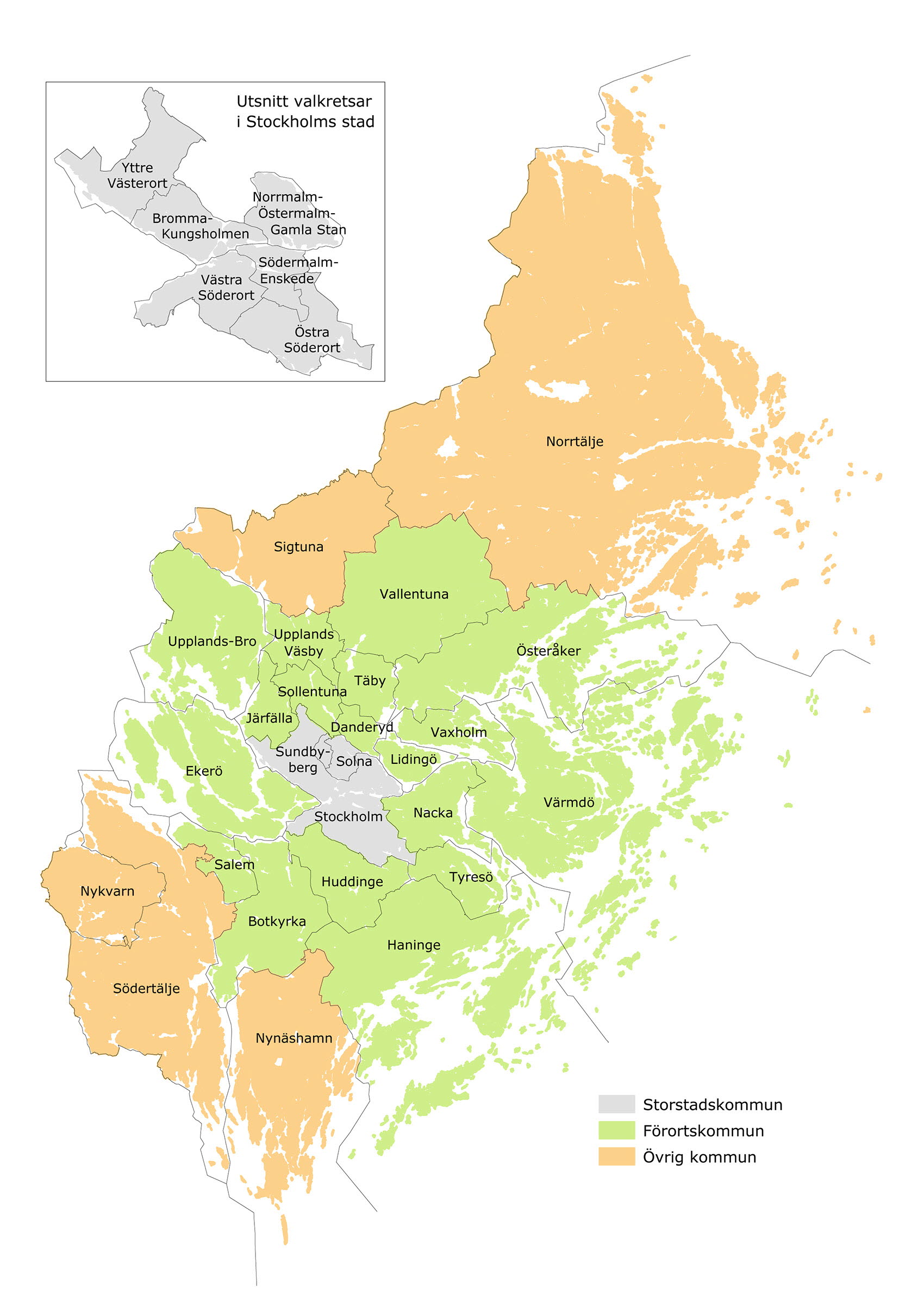 Karta 3.1. Karta över Stockholms läns kommuner och Stockholms Stads landstingsvalkretsar, uppdelat på storstadskommuner (här definierat som Stockholm, Solna och Sundbybergs stad), förortskommuner och övriga kommuner. Gruppen övriga kommuner benämns även pendlingskommuner och landsortskommuner.