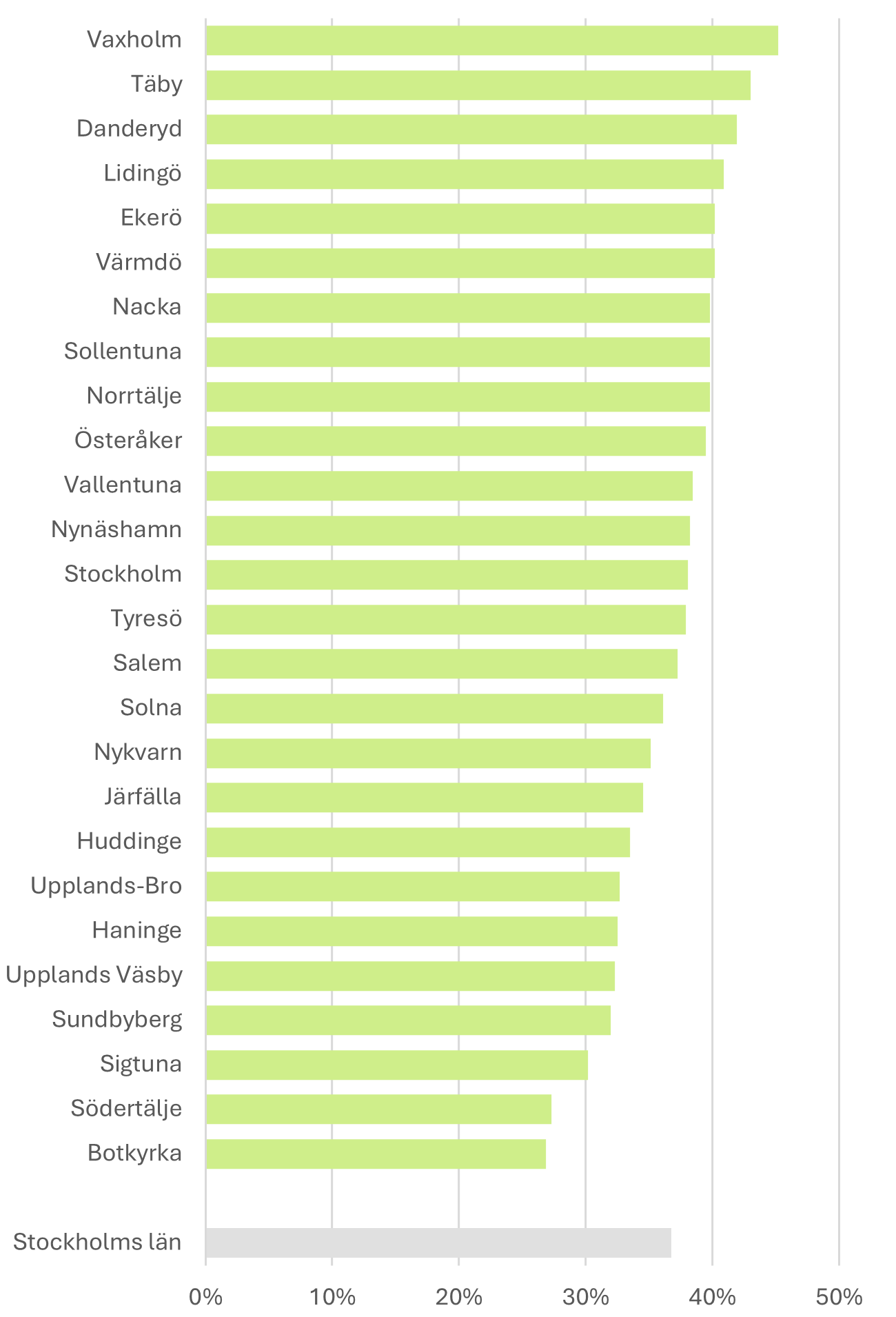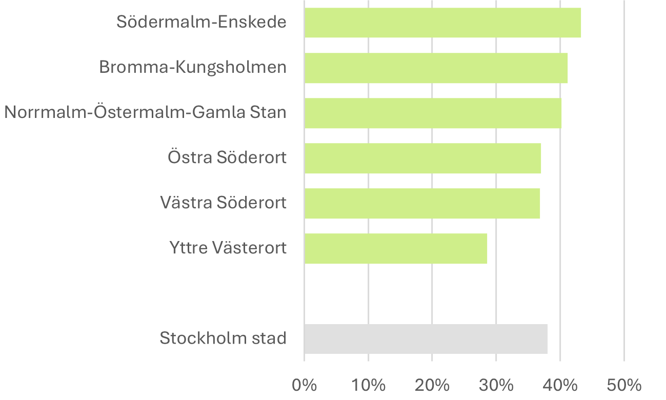 Sammanlagt svarade 46 282 (36,8 procent) på enkäten (tabell 3.1). Högst svarsfrekvens hade Vaxholm (45,3 procent), Täby (42,9 procent) och Danderyd (41,8 procent) medan Botkyrka (26,8 procent), Södertälje (27,2 procent) och Sigtuna (30,2 procent) hade lägst svarsfrekvens (figur 3.1). Även inom Stockholms stad varierade svarsfrekvensen kraftigt mellan de olika områdena, från 43,2 i Södermalm-Enskede till 28,4 i Yttre Västerort (figur 3.2).