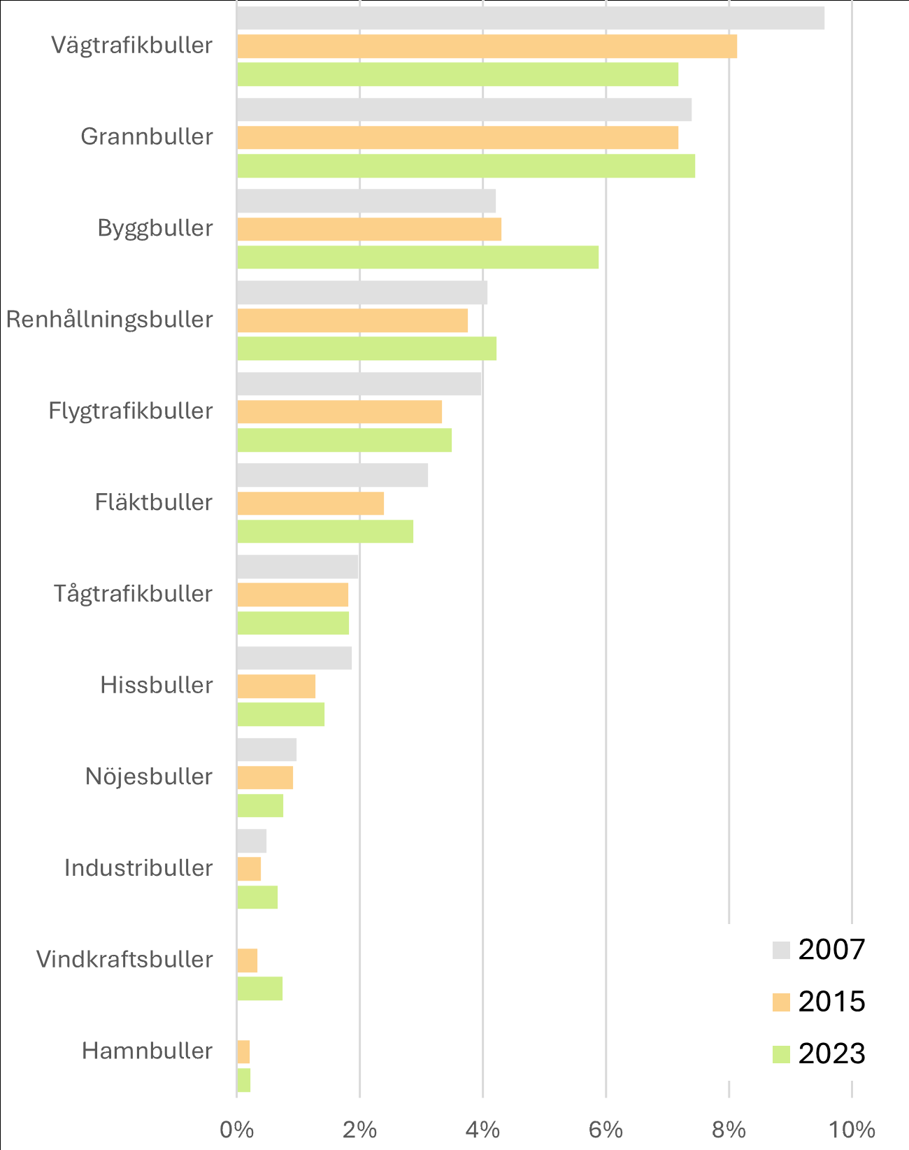 [1] Då frågan omformulerats sedan den senaste undersökningen och nu inte omfattar bostad som vetter mot tunnelbana eller spårväg går det inte att jämföra skillnader i förekomst över tid.