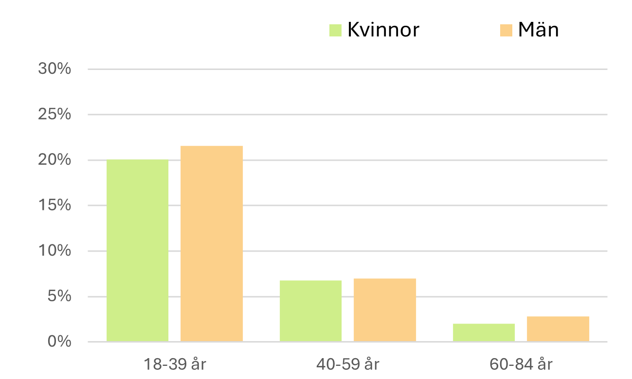 [2] Beräkningarna utgår ifrån de personer (18–84 år) som besvarat MHE 23 i Stockholms län och SCB:s vikter för skattning av prevalenser i totalbefolkningen. Resultaten ska inte jämföras med föregående undersökning då frågan har ändrats.