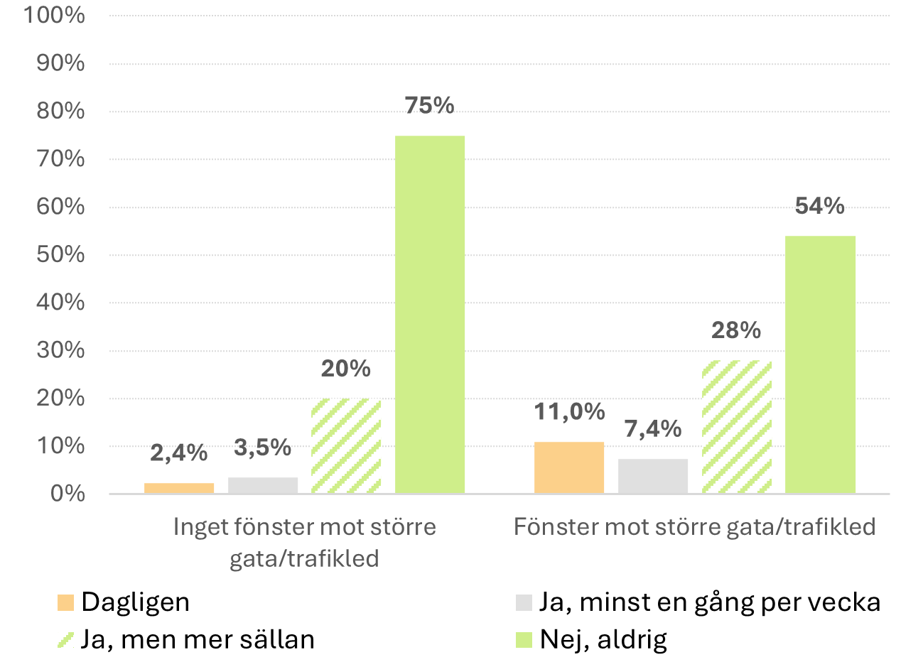 Resultaten från MHE 23 visar att de som bor i en bostad med fönster som vetter mot en större gata eller trafikled rapporterar att de besväras av bilavgaser i mycket högre utsträckning än de som inte har fönster mot trafikerat läge (figur 4.2). Ytterligare en källa till besvär för länets invånare, förutom bilavgaser, är vedeldningsrök. Andelen som uppger att de har svårt att vädra på grund av lukt från vedeldning är 4,8 procent och på grund av stoft/sot 2,3 procent.