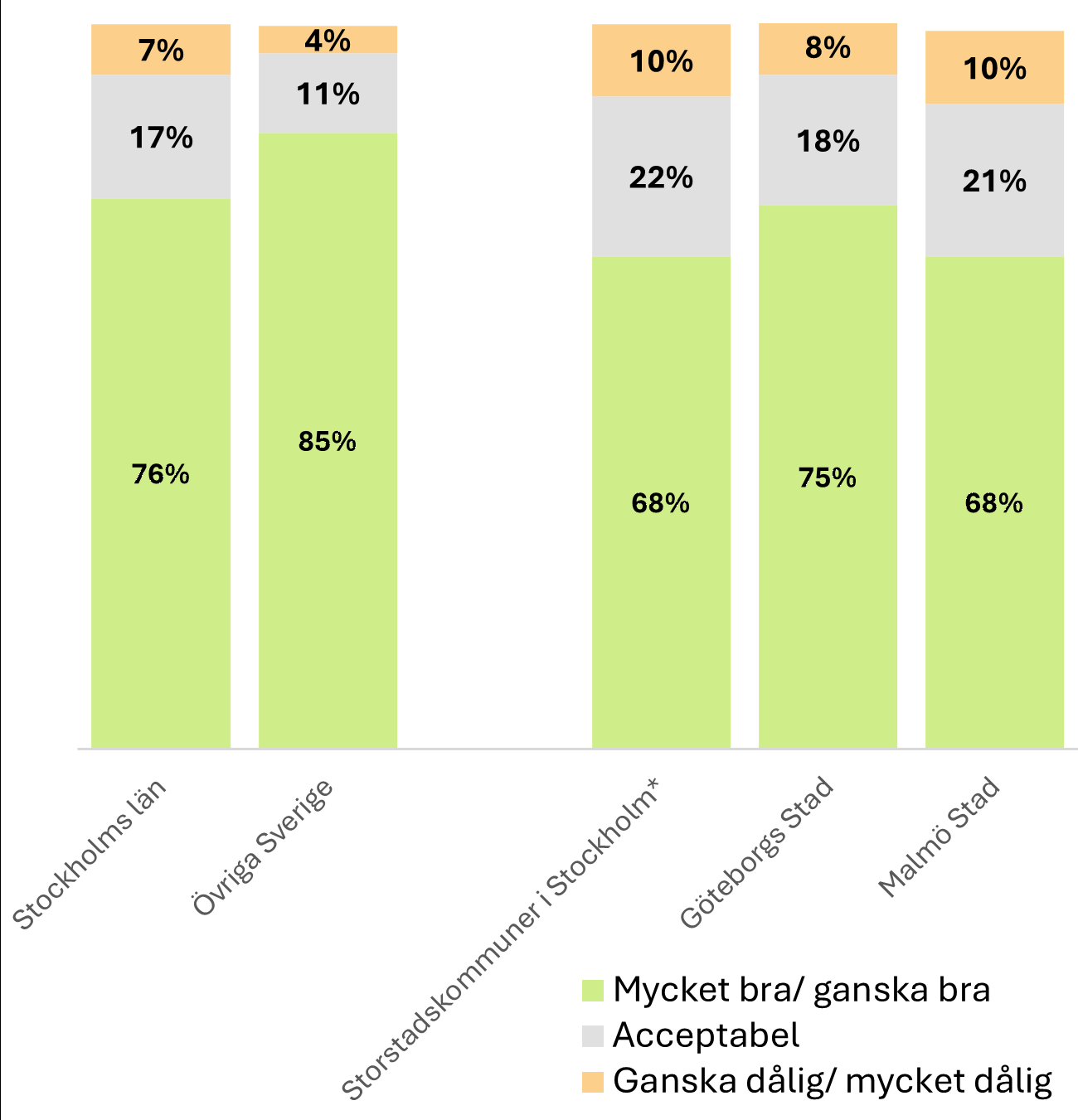 Figur 4.1 Upplevelse av luftkvalitet. Andel (procent) av befolkningen (i Stockholms län, och i övriga Sverige samt i Stockholms stad, Göteborg Stad och Malmö stad) som uppger att luftkvaliteten är Mycket bra/bra, Acceptabel eller Ganska dålig/mycket dålig utanför bostaden.