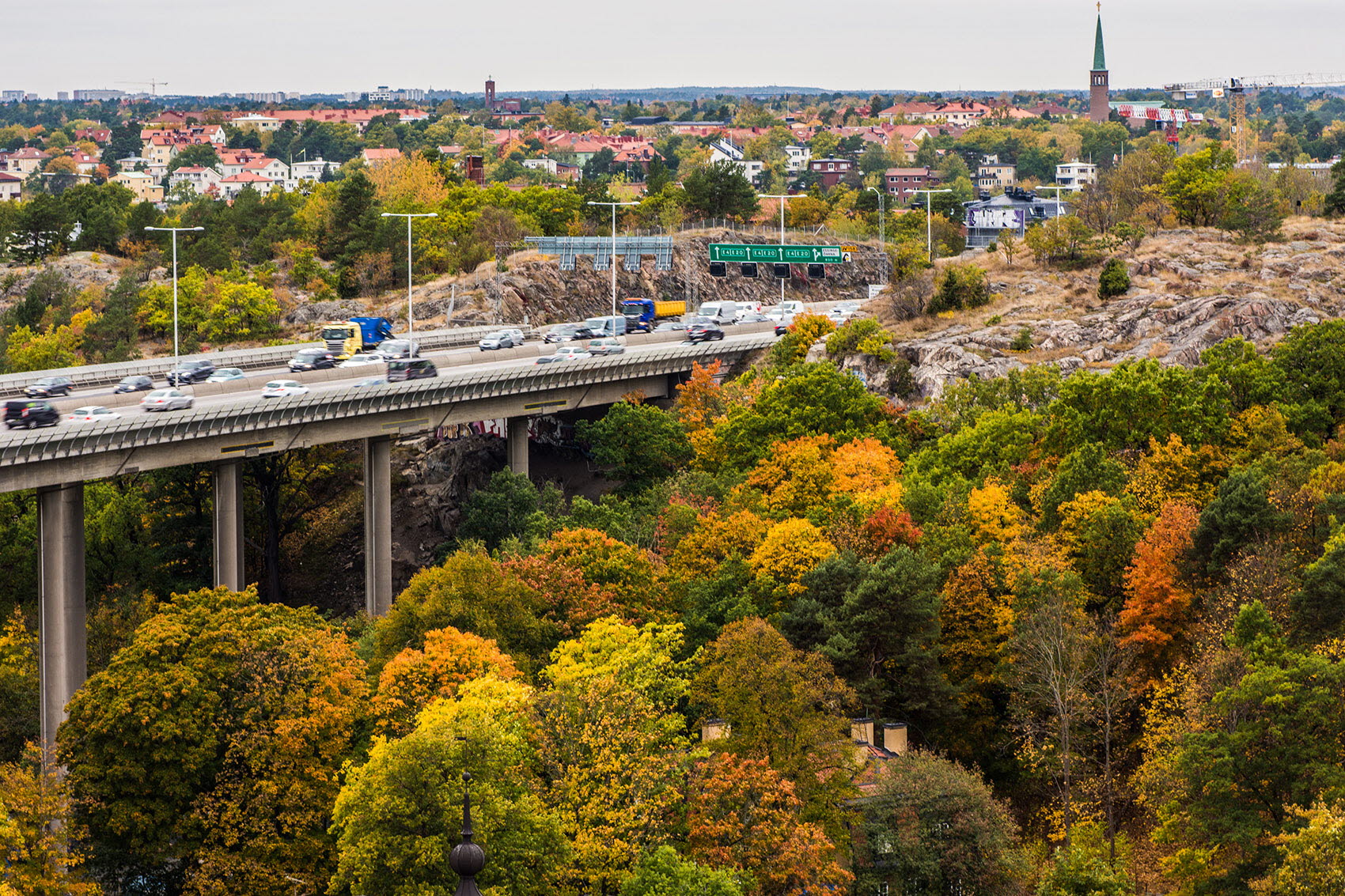 Fotografi av Essingeleden i Stockholm med träd som börjar övergå i höstgult och orange runt. Mycket trafik.